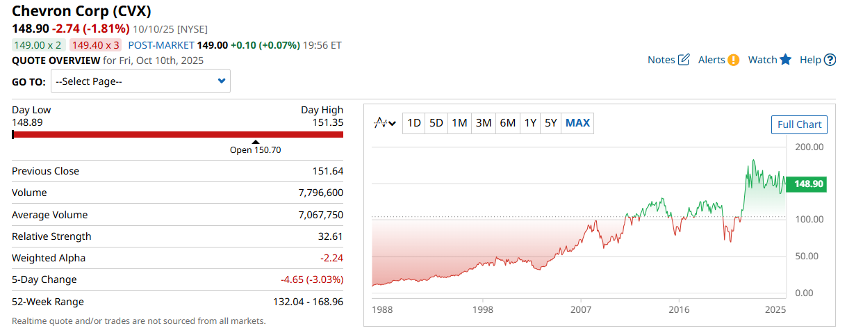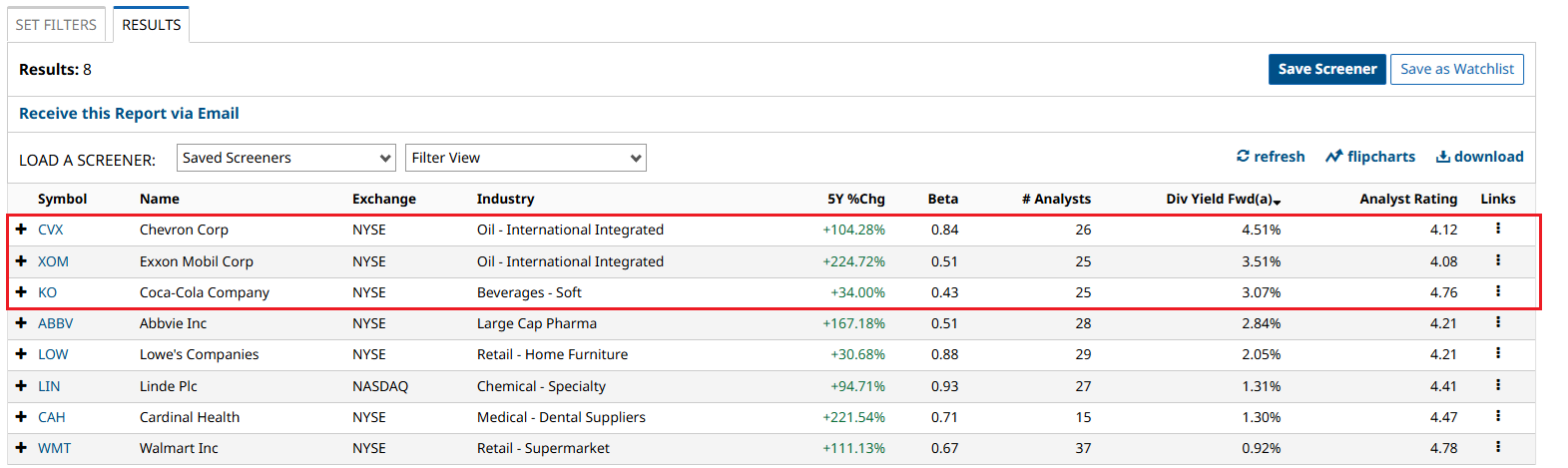 After setting the appropriate filters, I ran the screen and was left with the 8 dividend companies. Then, I sorted out the list from highest to lowest forward dividend yield, and ended up Chevron Corp. (CVX), Exxon Mobil Corp. (XOM), and Coca-Cola Company (KO) as my top 3 highest-yielding, most stable Dividend Aristocrats with a notable potential for capital appreciation. Chevron Corp (CVX)Chevron Corp. is one of the largest energy companies in the world. They do everything from oil exploration, extraction, and refining, before selling it to enterprise customers or everyday consumers at your nearest Chevron gas station. Recently, the company has also begun investing in cleaner energy options, while maintaining its core oil and gas business. For 2024, Chevron’s annual revenue rose nearly 1% to $202.78 billion, while its net income dropped 17.35% to $17.66 billion, driven by a notably higher OpEx over the same period. This resulted in a reduced basic EPS of $9.76 (from $11.41). Today, CVX stock trades at $148.90 per share, and has gained nearly 3% on a YTD basis, while 104.28% on a 5-YR scale. The stock’s 60-month beta is 0.84, which indicates stability. Chevron’s annual forward dividend is $6.84 per share per year, paid $1.71 per quarter. This reflects a forward yield of 4.51%, which is quite respectable in today’s market. The payout ratio is 78.51% of its total earnings, which is still acceptable, but may warrant investors’ attention should it move beyond 80%. A consensus among 26 analysts rates CVX stock a Moderate Buy with an average score of 4.12 out of 5, and has improved over the past 3 months. The highest price target for the stock is $197 per share, suggesting as much as 32% upside potential from current levels. Exxon Mobil Corp (XOM)The next dividend company is another energy titan, ExxonMobil, an oil and gas company that ranks among the largest publicly traded energy firms currently. Like Chevron, Exxon is also responsible for exploration, extraction, and refining oil and gas into usable products, as well as manufacturing petrochemicals. The company is also working on low-emission innovation and carbon reduction initiatives. As for Exxon’s financials, the company’s 2024 annual revenue increased nearly 1.5% to $349.58 billion. However, its bottom line figures decreased 6.47% to $33.68 billion, driven by the notably higher cost of goods. Right now, XOM stock trades at $110.73 per share, gaining nearly 3% on a YTD basis while ~225% on a 5YR scale. The 60-month beta is only 0.51, which makes it a very stable dividend stock. On the dividend front, Exxon pays a forward dividend of $3.96, which is distributed as $0.99 per quarter (per share), reflecting a forward yield of 3.51%. Meanwhile, the dividend payout ratio is 55.24% of its earnings, which is within a very acceptable range for a dividend-paying company. A total of 25 analysts rate XOM stock a Moderate Buy with an average score of 4.08 out of 5. This rating has been consistent over the past 3 months. The highest price target is $143 per share, which suggests about 30% potential upside for new investors. Coca-Cola Company (KO)The last company on my list today is Coca-Cola Company, the largest beverage company in the world. Apart from its iconic Coke, the company also produces over 500 different brands worldwide, including sodas, water, sports drinks, tea, and even coffee. In terms of Coca-Cola’s financials, Coca-Cola’s 2024 revenue rose by 2.8% to $47.06 billion, while its net income remained relatively flat at ~$10.6 billion, or a basic EPS of $2.47. Right now, KO stock trades at $67.04 per share with a 60-month beta of 0.43. Since the beginning of the year, the stock has gained 7.68% and ~34% on a 5-YR scale. Meanwhile, the company pays a forward dividend of $2.04 per share, which is paid $0.51 per quarter. This payout reflects a forward yield of 3.07%, with a payout ratio of 67.87%. A consensus among 25 analysts rates KO stock a Strong Buy with an average score of 4.76 out of 5, and this rating has been consistent over the past 3 months. The highest target for the stock is $85 per share, which indicates as much as a 27% upside from the stock’s current levels. VerdictThese 3 dividend companies are some of the most compelling options for investors who prefer the set-it-and-forget-it approach. They have a solid track record, as well as income and capital appreciation potential. That said, it's imperative to consider any potential investment from various angles, and the filters used to come up with the list of companies are a good starting point for due diligence. After all, the market can turn silly at any time. On the date of publication, Rick Orford did not have (either directly or indirectly) positions in any of the securities mentioned in this article. All information and data in this article is solely for informational purposes. For more information please view the Barchart Disclosure Policy here. |